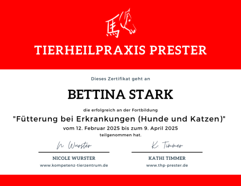 Zusätzlich habe ich den Ernährungsberater und den Darmaufbau für Hunde und Katzen bei der Tierheilpraxisschule Prester absolviert. Eine ausgewogene Ernährung und ein gesunder Darm sind für mich ein wichtiger Baustein für die Gesundheit , aber nur ein Teil des Ganzen.