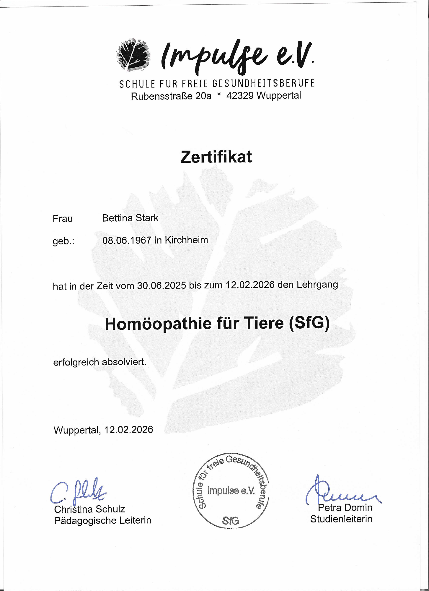 Mai 2024 - Zertifizierung zum Tierheilpraktiker Impulse e.v.