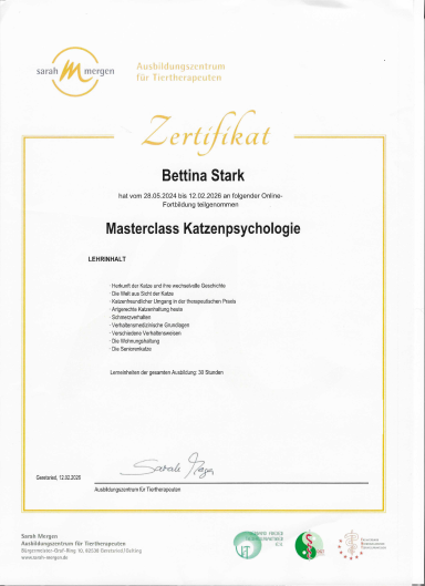 Mai 2024-Februar 2026 Masterclass Katzenpsychologie Ausbildungszentrum für Tiertherapeuten Sarah Mergen